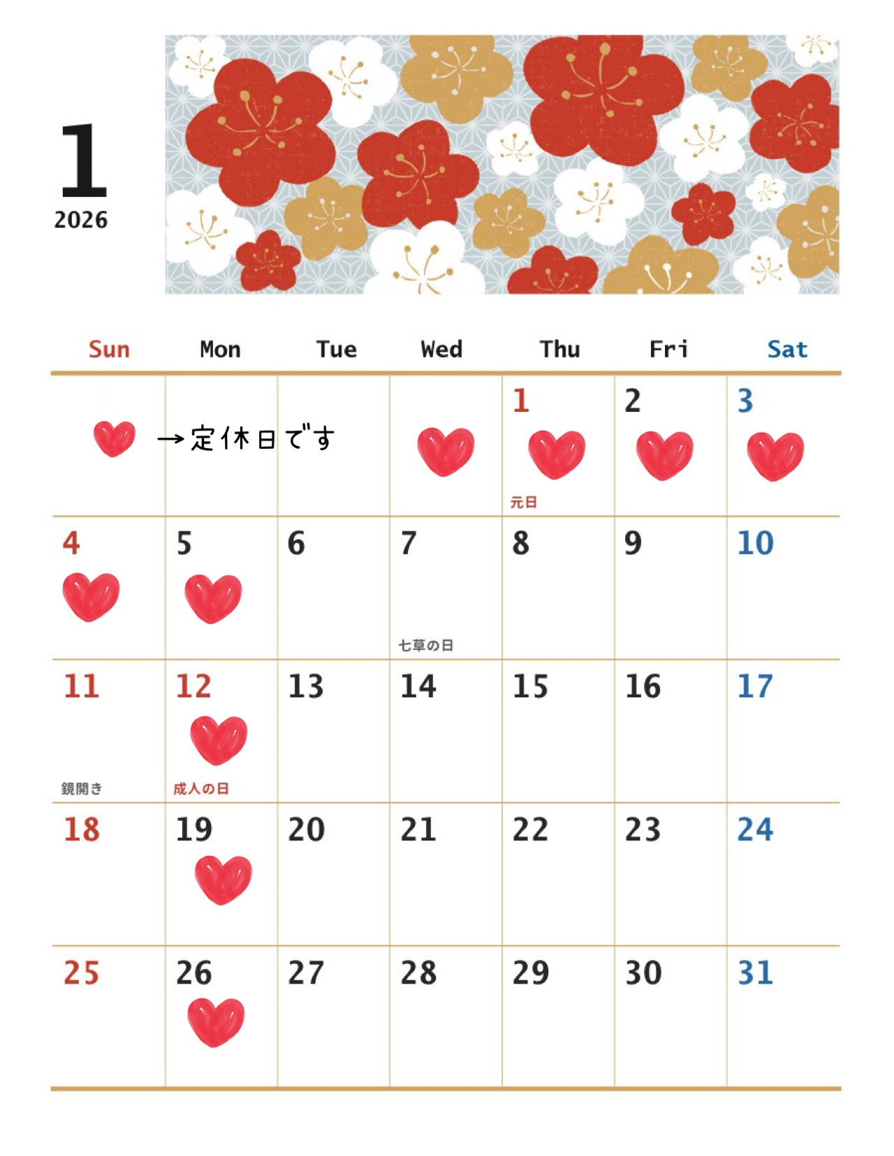 1月の営業日のおしらせ