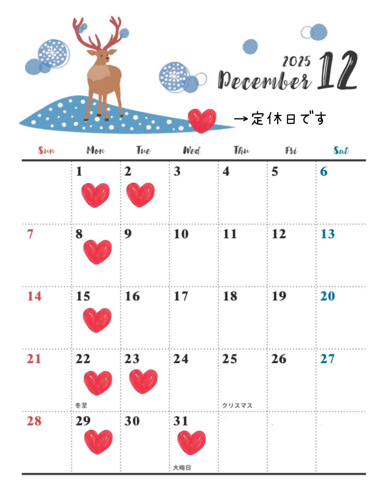 ⭐️12月21日(第3日)は営業します。23日(火)はお休みをいただいております。